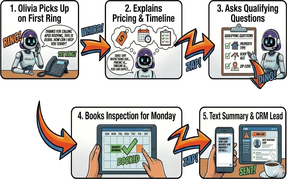 Olivia is an AI voice agent built specifically for your business. She knows your services, your hours, your FAQs, and your brand voice. She answers calls naturally, qualifies leads, books appointments, and routes the important stuff to your team - all without anyone lifting a finger.